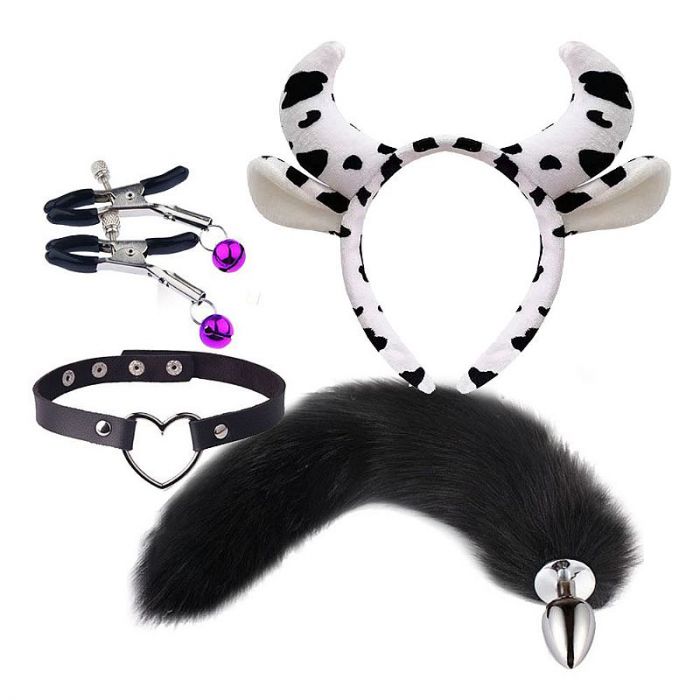 Kit de Plug Anal Pompom com Tiara de Orelhinhas Vaquinha Preto e Branco - SI