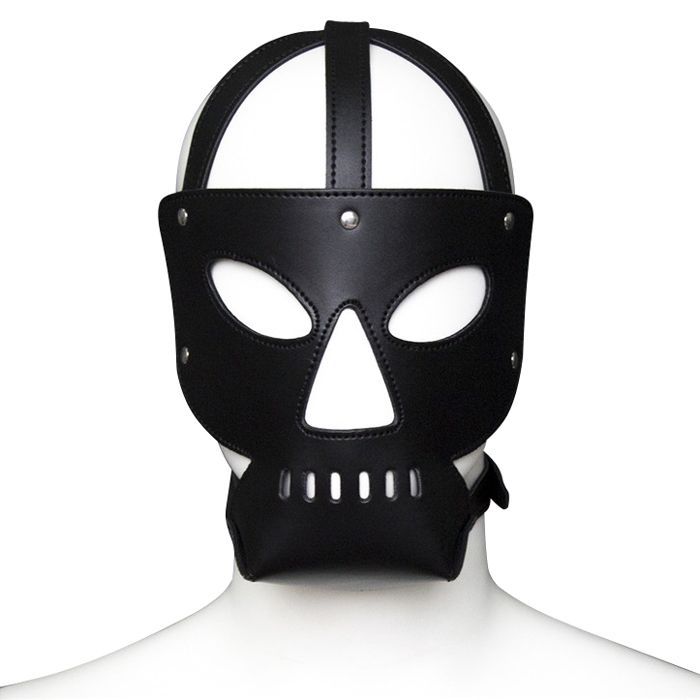 Parte frontal em couro com aplicações metálicas; parte de trás com tiras ajustáveis. Aberturas para os olhos em forma oval permitindo ver, mantendo um visual de intimidação. Ajustável nas laterais com fivelas de metal.