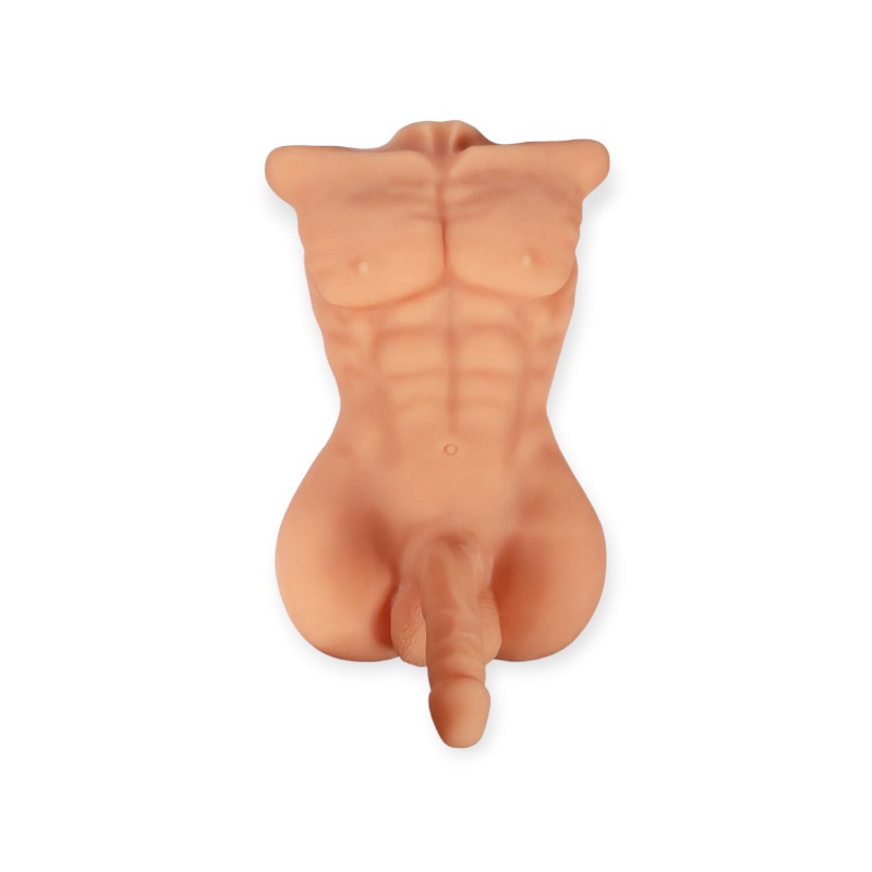Seu design em formato de tronco masculino apresenta músculos definidos e detalhes anatômicos que deixam o visual ainda mais realista. O modelo inclui pênis robusto com glande definida, escroto e acabamento detalhado.