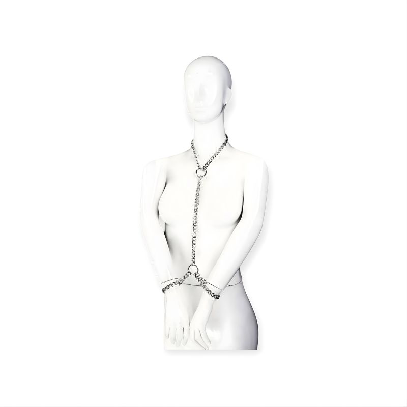 O conjunto é formado por uma coleira e duas algemas, confeccionadas em correntes de metal resistentes, utilizando mosquetões redondos que garantem firmeza e praticidade no uso. A corrente central é removível, permitindo diferentes configurações e possibilidades de restrição conforme o momento e a imaginação.